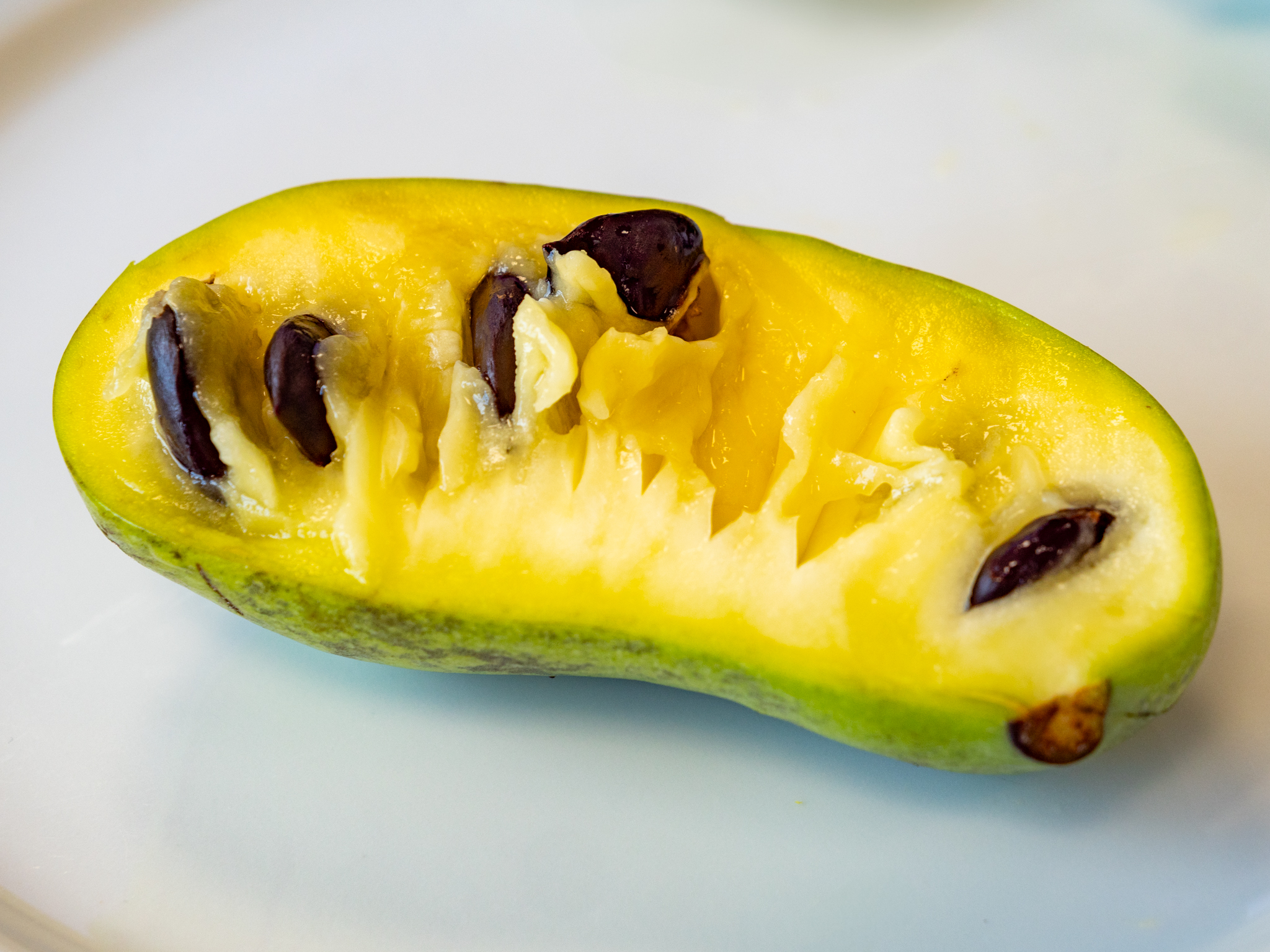 Le Asimina triloba a une à croissance lente et peut atteindre une hauteur jusqu’à éventuellement 4-6 m, à croissance lente, en fonction du lieu de plantation et des conditions climatiques.