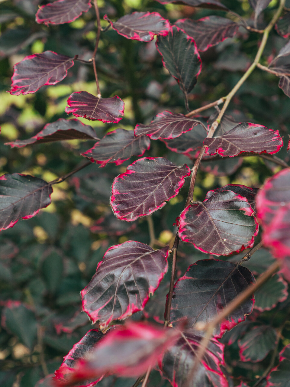 Les feuilles de Fagus sylvatica 'Purpurea Tricolor' ournent au colors% à l’automne.