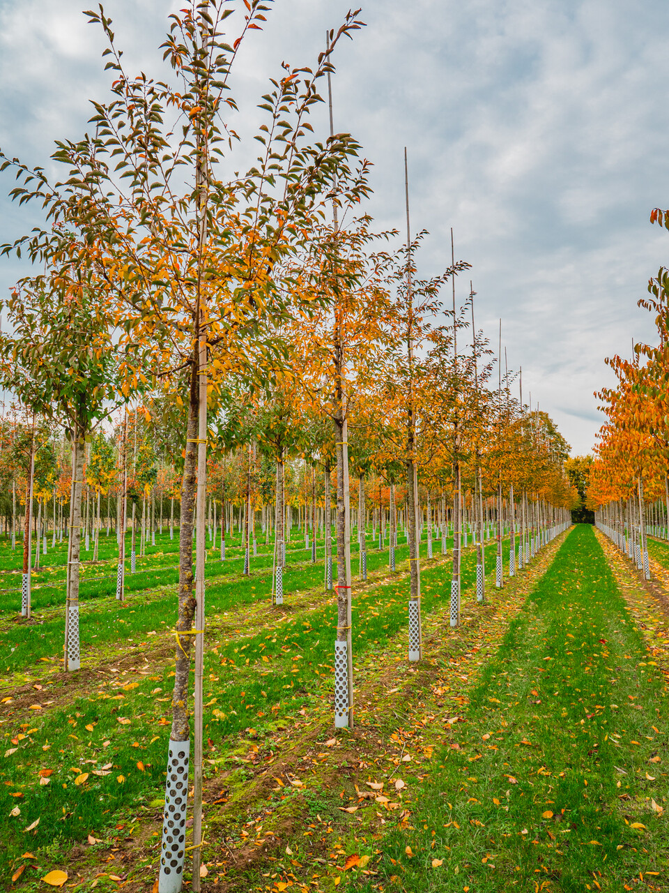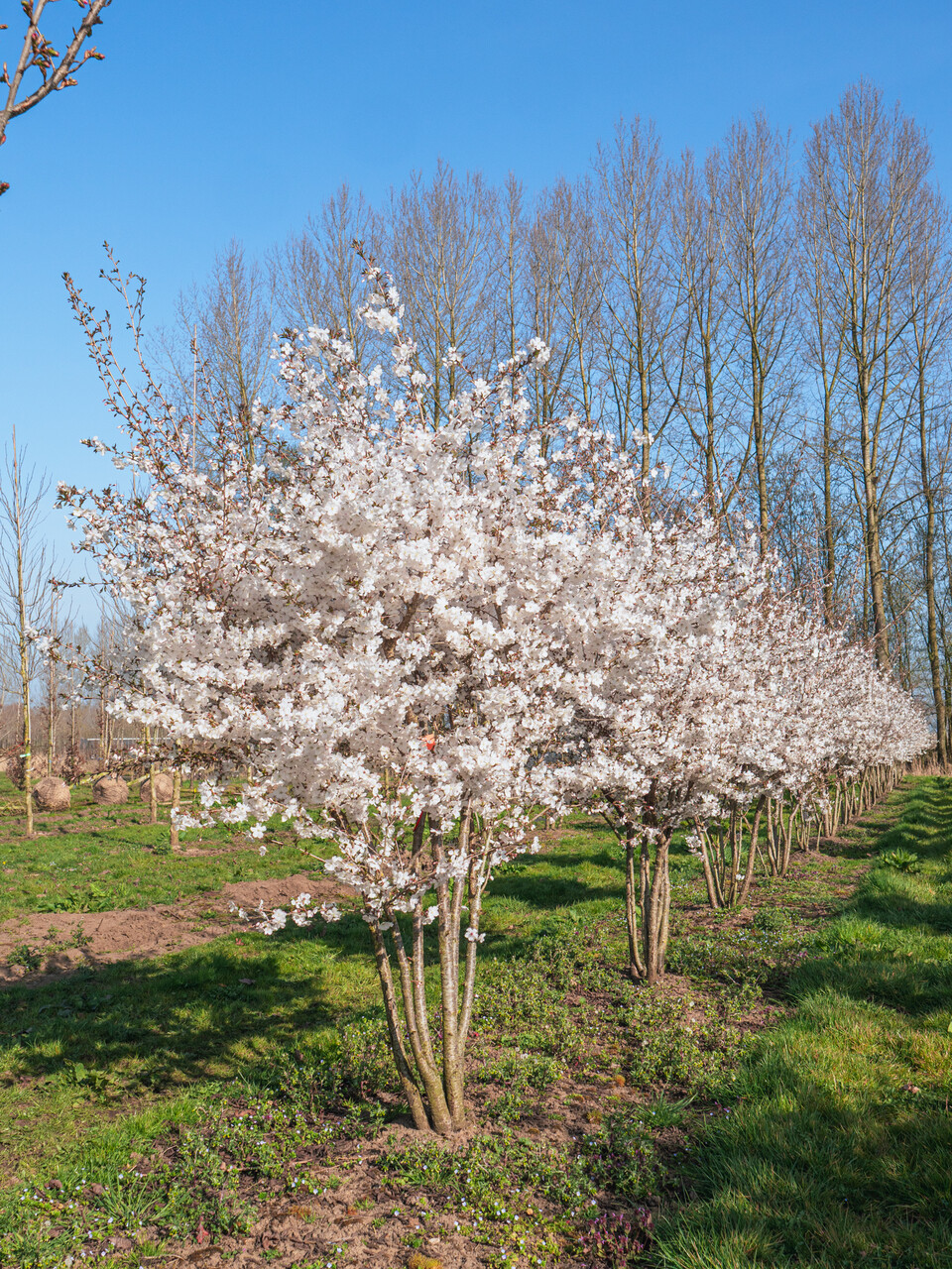 Arbre petit à moyen, initialement à couronne assez élancée, mais rapidement évasée étalée. Les branches retombent légèrement plus tard, formant ainsi une couronne ancipitée sphérique. La feuille est ovoïde-lancéolée à oblongue, avec un apex aigu. Elle est de couleur bronze et vert clair lorsqu’elle se déploie l’été. L’automne, elle se teinte de toutes sortes de nuances orange, rouges et pourpres avant de tomber. Les bourgeons sont roses. Avant la sortie des feuilles, l’arbre connaît une floraison abondante avec de grandes fleurs blanches simples, aux étamines roses remarquables. Elles sont suivies de fruits rouge foncé, arrondis à légèrement ovales. ‘The Bride’ a été découvert par Harry van Trier comme semis du P. ‘Pandora’. Excellente alternative pour le P. x yedoensis, qui grandit nettement plus. Ne supporte pas de crues permanentes.