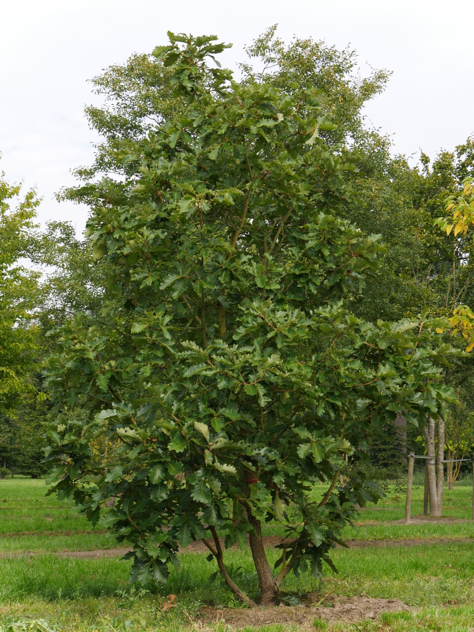 Arbre moyen à couronne régulière, pouvant atteindre environ 15 m. Il pousse à la verticale, avec une branche principale rectiligne. Sa couronne est élancée lorsqu’il est jeune, pour prendre plus tard des formes ovales étalées à arrondies. L’écorce grise est profondément cannelée. Les jeunes rameaux sont remarquablement épais et pubescents duveteux. Les grandes feuilles sont rigides et coriaces. La feuille obovoïde, vert foncé mat, atteint jusqu’à 25 cm de long et la moitié en largeur. Sans prendre de teintes automnales, elle reste suspendue dans l’arbre une bonne partie de l’hiver. Les glands sont regroupés par petits fascicules. D’environ 2 cm, ils sont entourés à moitié par la cupule. Ce cultivar a été sélectionné par les De Belder sur leur domaine privé Hemelrijk en Belgique à partir de graines rassemblées en Corée lors d’une visite chez Carl Ferris Miller. Miller est un Américain, fondateur du Chollipo Arboretum en Corée du Sud. Superbe arbre pour parc.