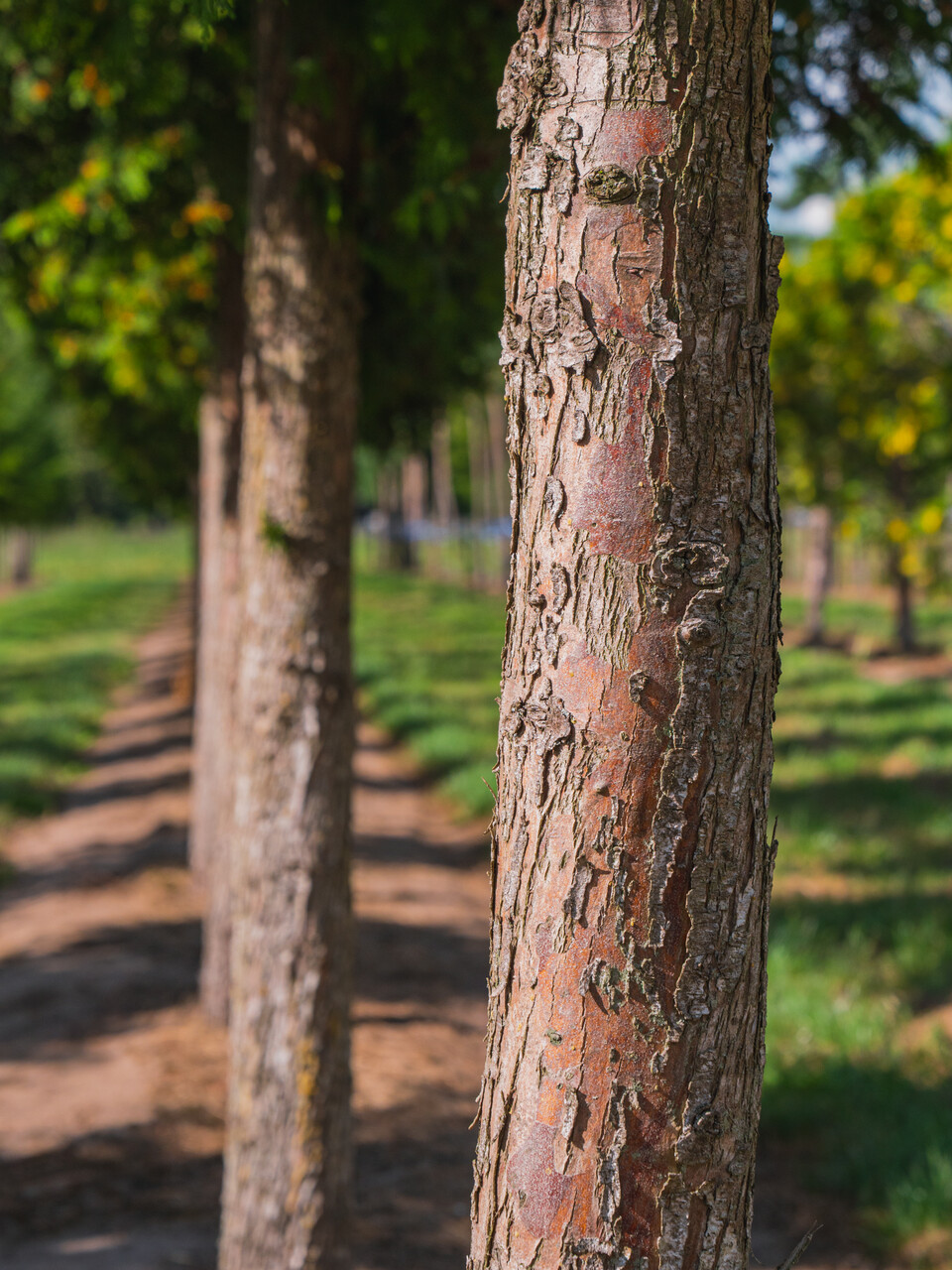 rameaux verts à brun orange, écorce brun rouge, se détachant en fines lanières
