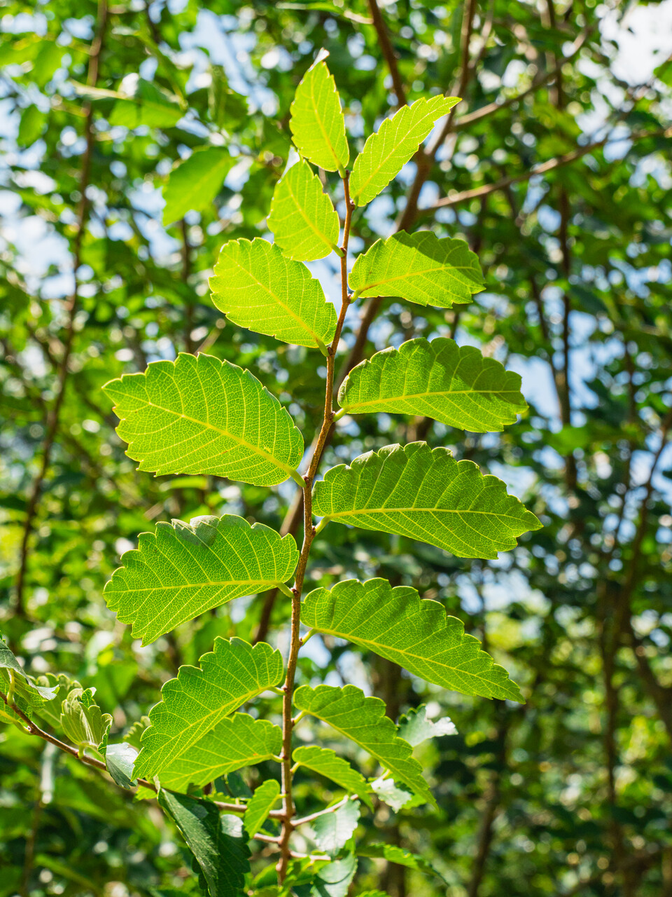 Grand arbre aux formes et aux ramifications clairement montantes. Les branches sont souvent implantées assez bas. La couronne finit par devenir ovale à évasée, et atteint 25 à 3 m de haut. Ses jeunes rameaux sont bruns et glabres. L’écorce mature est brun gris, initialement lisse, mais se détache plus tard en petites plaques, découvrant ainsi le liber orange. La feuille ovoïde à ovale, légèrement inclinée, est vert foncé, rugueuse et velue sur le dessus. Le revers est plus clair, et duveté. À l’automne, la feuille se teinte de jaune marron. Les fleurs vertes discrètes éclosent durant ou juste après la sortie du feuillage, et sont suivies de petits fruits arrondis inclinés. Au premier regard, l’arbre ressemble quelque peu à l’Ulmus parvifolia, mais il s’en distingue entre autres par ses fleurs unisexuées et ses fruits non ailés. Cet arbre convient aisément aux parcs grâce à sa belle couronne.