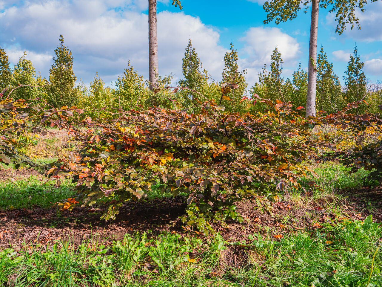 L'écorce est grise et relativement lisse, acquérant plus de structure avec l'âge, ce qui accentue encore la forme capricieuse. Les jeunes rameaux sont fins, souvent retombants et clairement tordus, créant une silhouette pleureuse. L'arbre fleurit discrètement au printemps avec de petits chatons, suivis de modestes faînes.