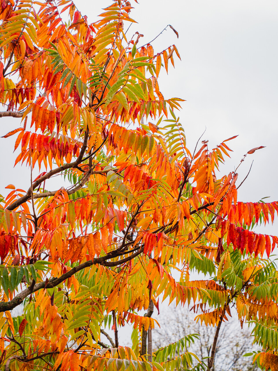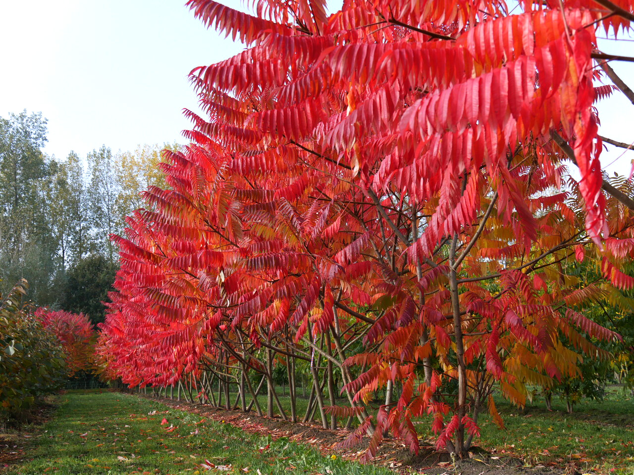 Les feuilles de Rhus typhina ournent au colors% à l’automne.