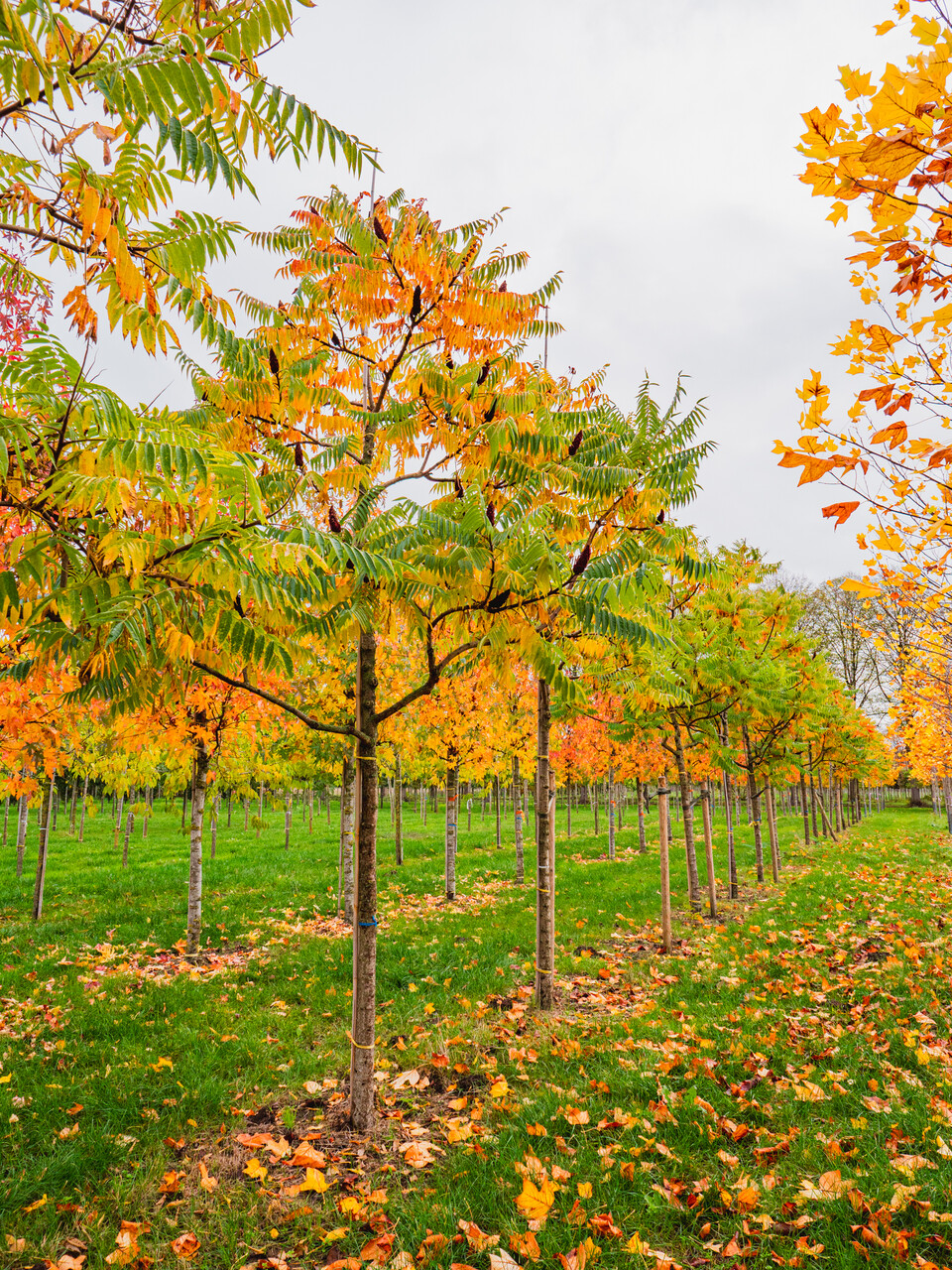 Le bon moment pour la plantation de Rhus typhina lors du repos végétatif. En Europe de l’ouest, les arbres Rhus typhina conditionnés en motte peuvent généralement être plantés entre mi-novembre et fin avril, mais cela dépend fortement des conditions climatiques et de l’espèce