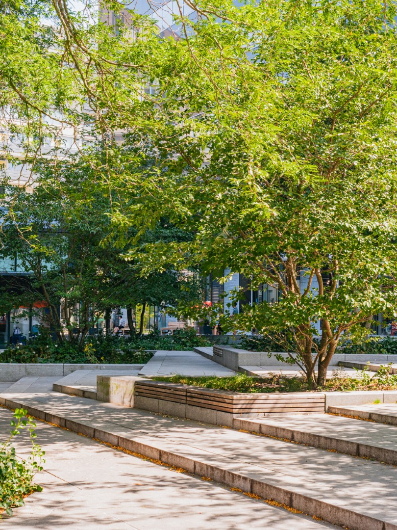 Sur d’autres sites du centre-ville, d’autres essences ont été utilisées, comme Tilia, Sorbus 'Dodong', Cornus mas, Robinia et Acer saccharinum. Cette combinaison d’essences crée un paysage urbain diversifié, résilient face au climat à long terme, et contribue à réduire le stress thermique ainsi qu’à améliorer l’infiltration de l’eau.