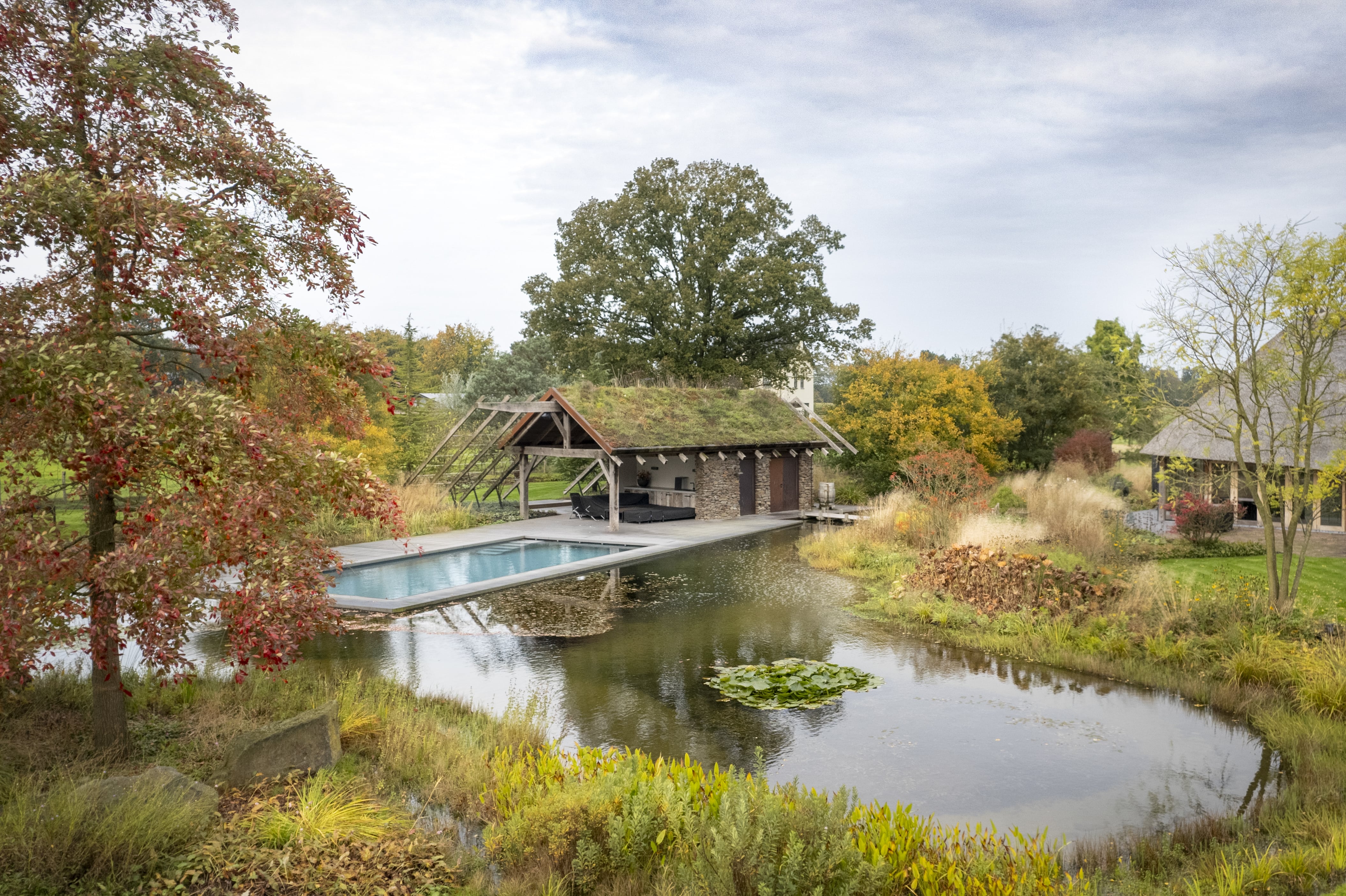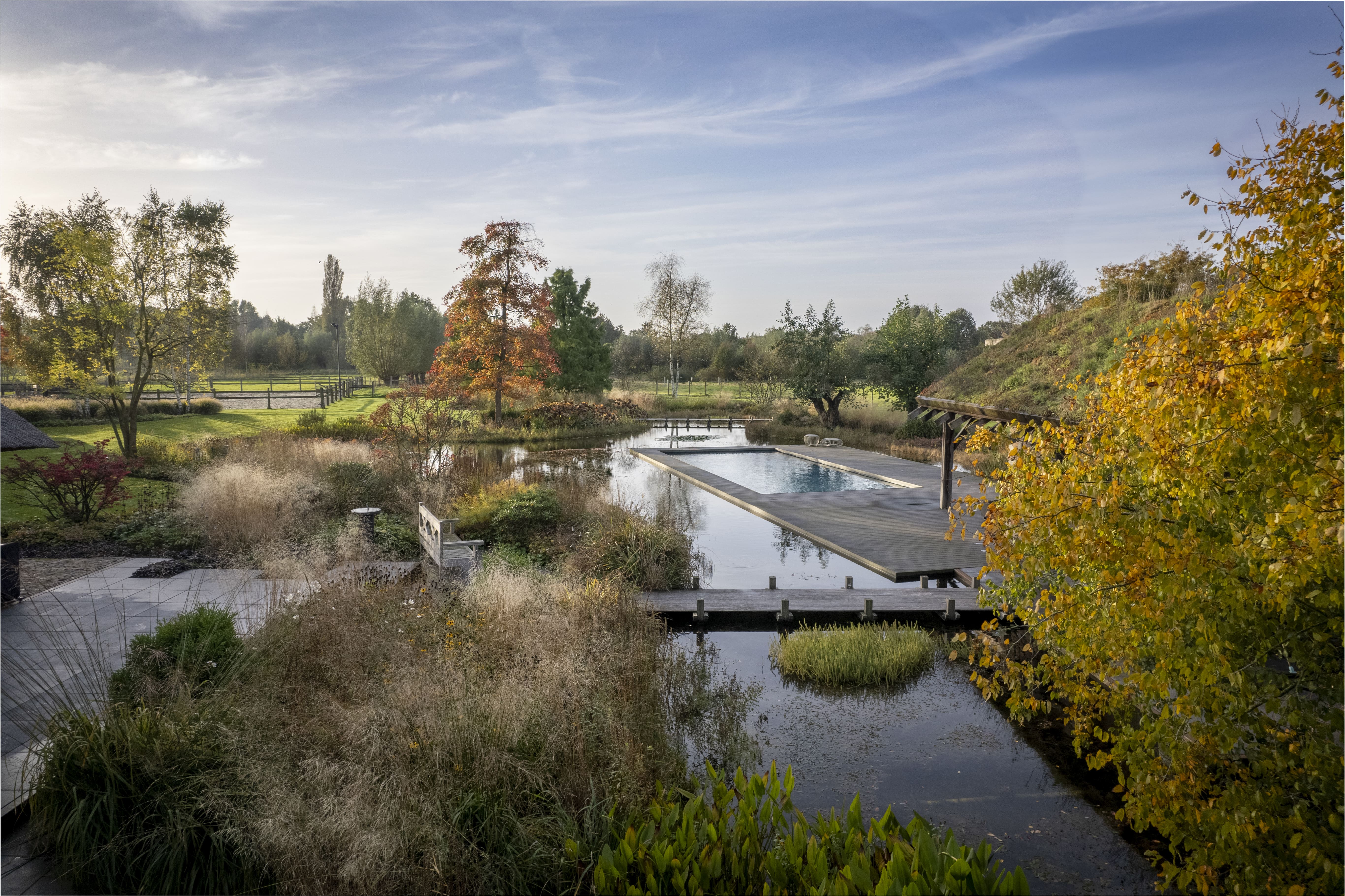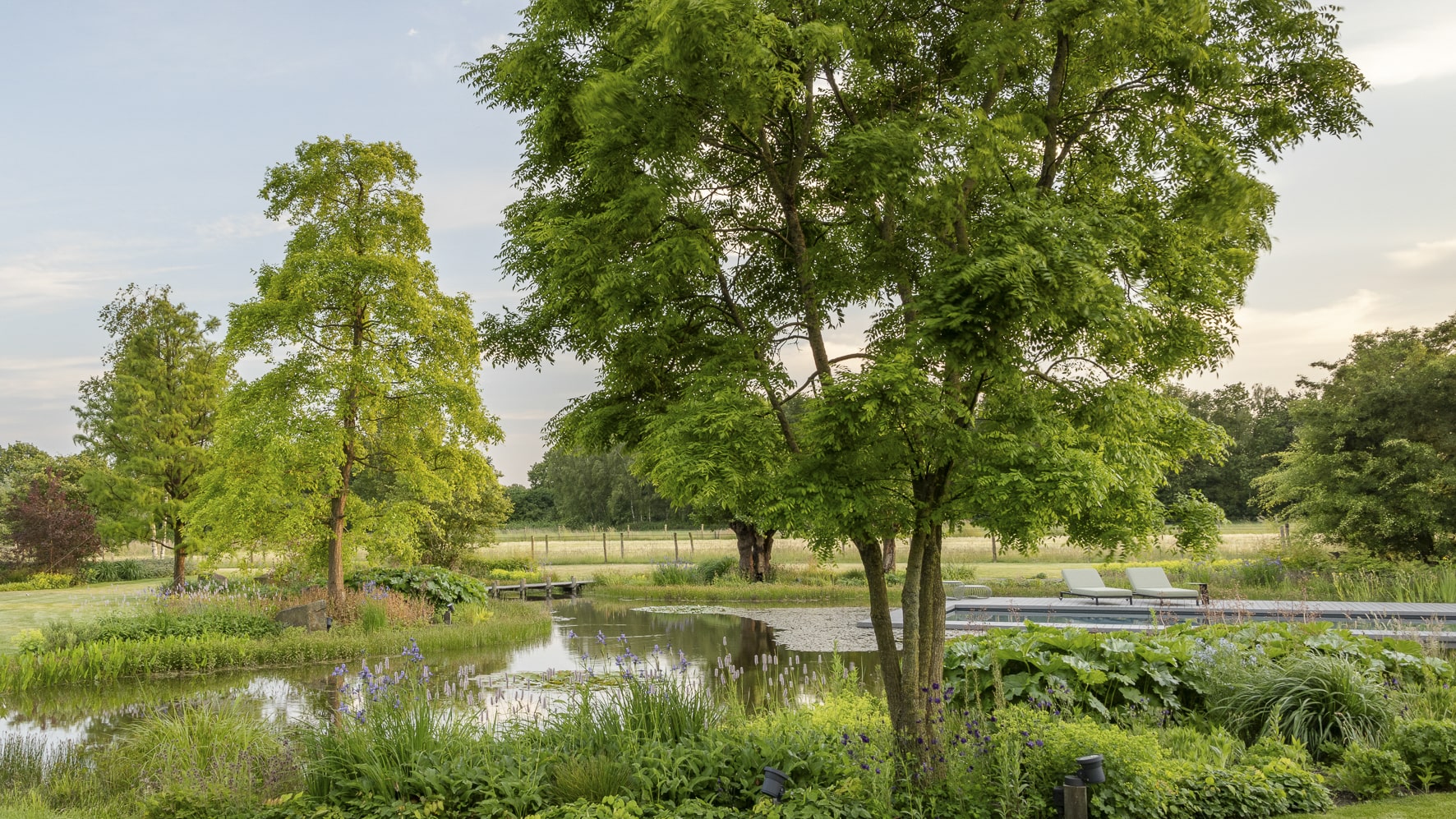En travaillant avec des spécimens matures et de caractère, le paysage acquiert immédiatement la tranquillité et le naturel d'une forêt mature. Les arbres définissent le caractère spatial, donnent de la hauteur au paysage plat du Brabant, et assurent une transition fluide entre les formes organiques du design du jardin et la nature protégée environnante.