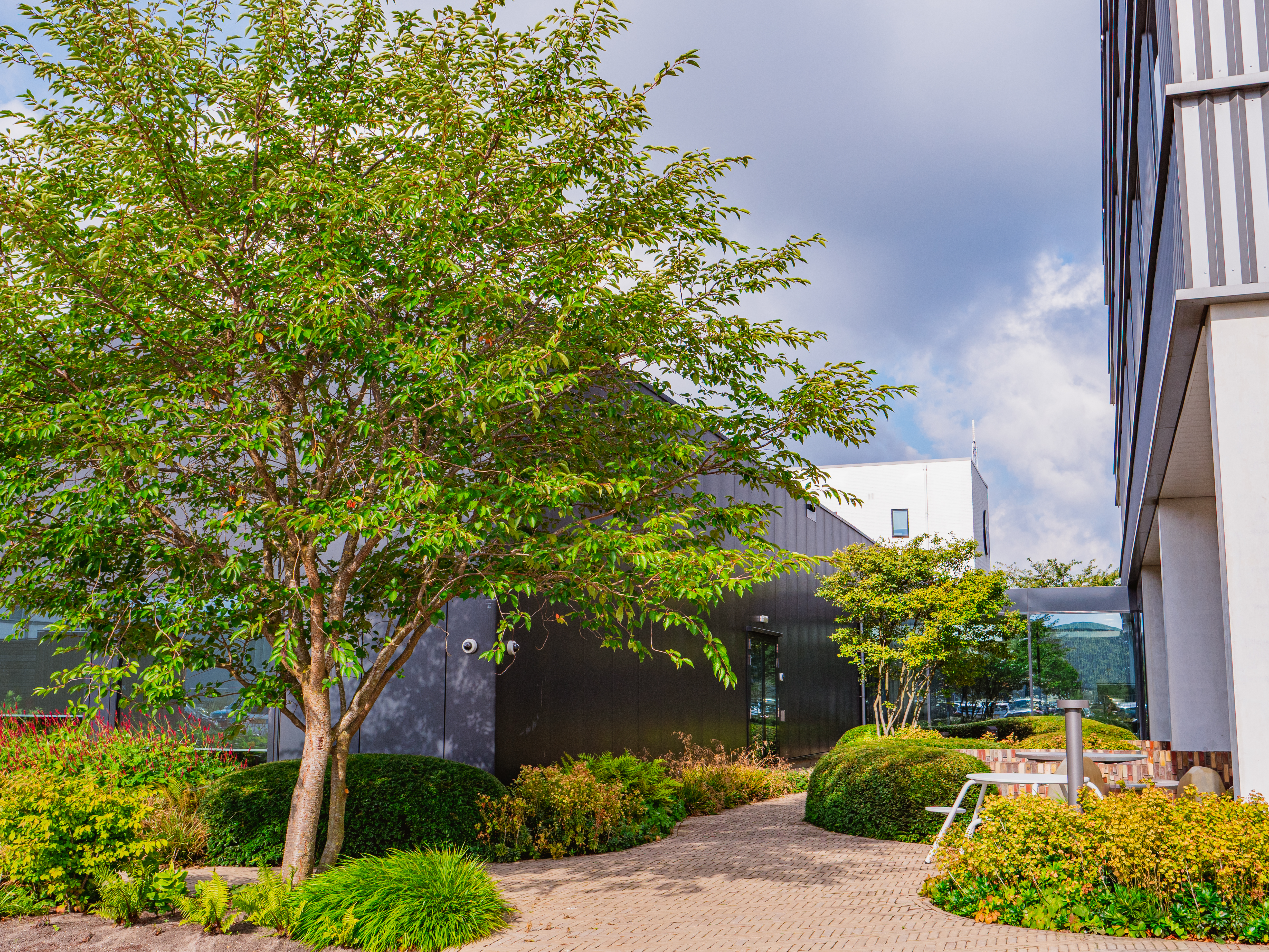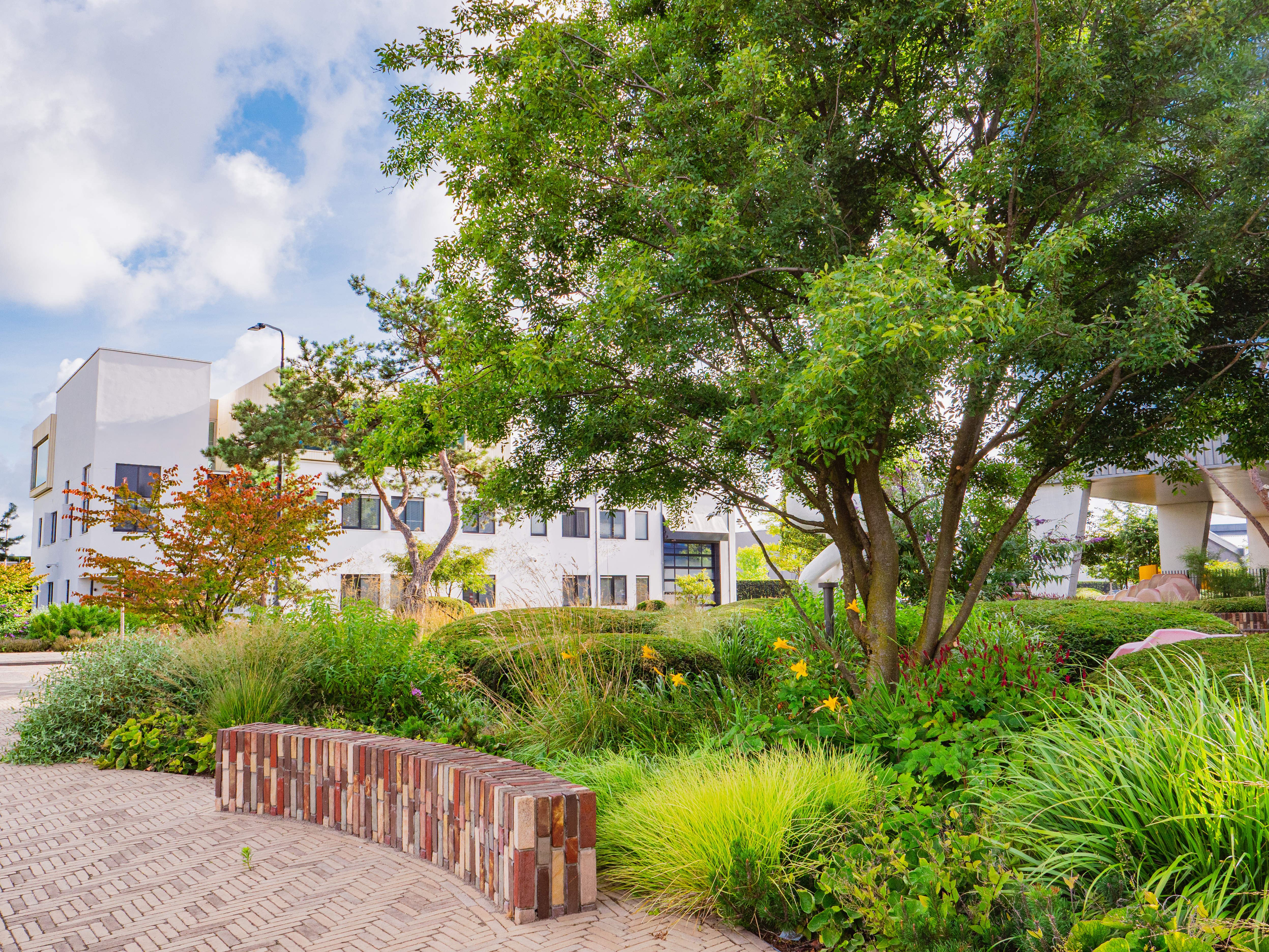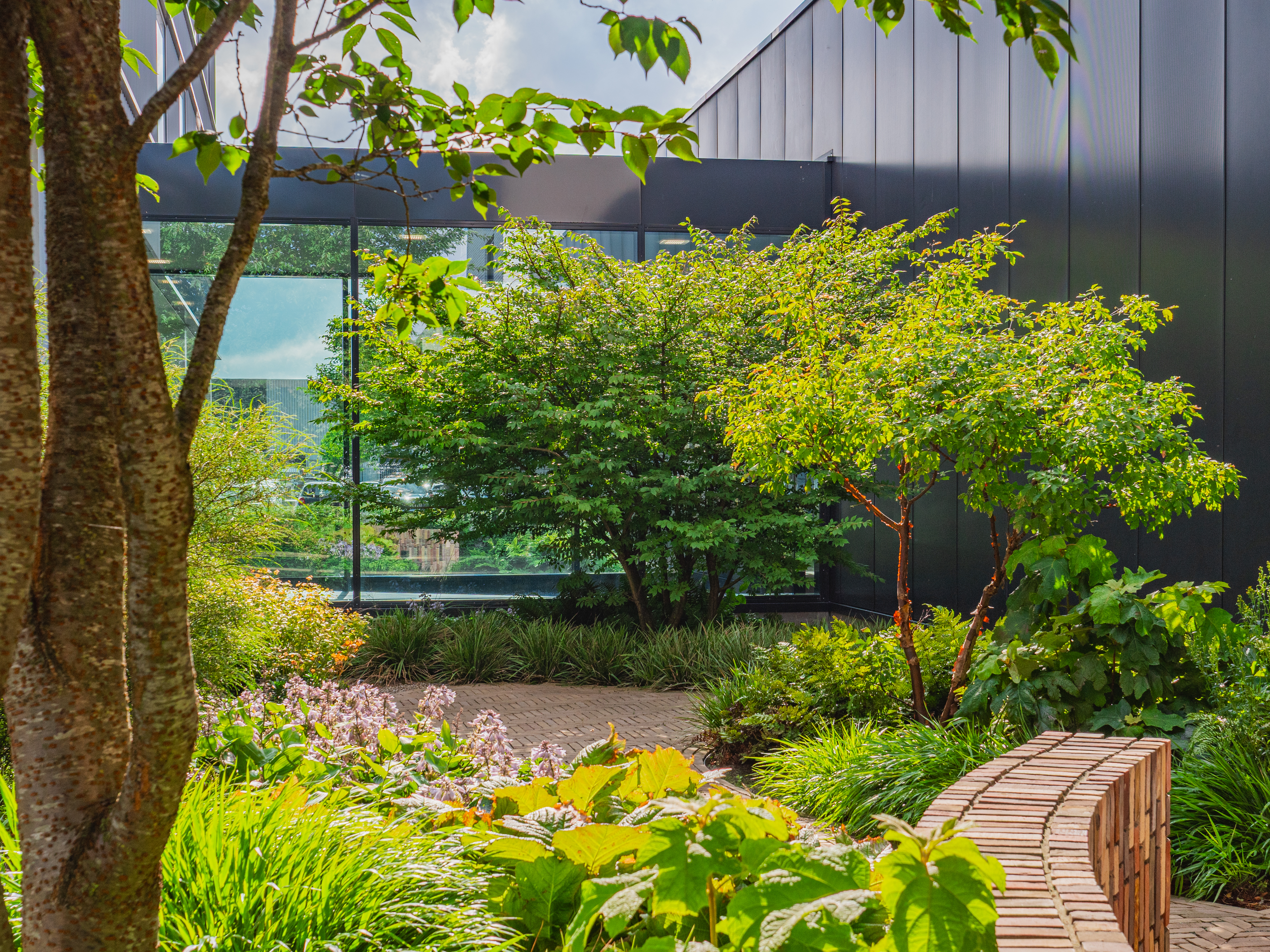 Au printemps, Prunus 'Accolade' colore le site de rose, avec des fleurs pleines, semi-doubles, portées par des rameaux encore nus, avant même le débourrement. Amelanchier lamarckii fleurit en blanc au même moment et prend en automne des teintes orange-rouge. Acer griseum se distingue par son écorce fine, exfoliante, brun cannelle, et son feuillage d’automne rouge vif. Zelkova carpinifolia 'Verschaffeltii' forme avec le temps un large vase au feuillage finement denté, robuste et peu exigeant. Quant à Pinus sylvestris, il structure l’ensemble en hiver, lorsque le reste du choix végétal est dénudé.